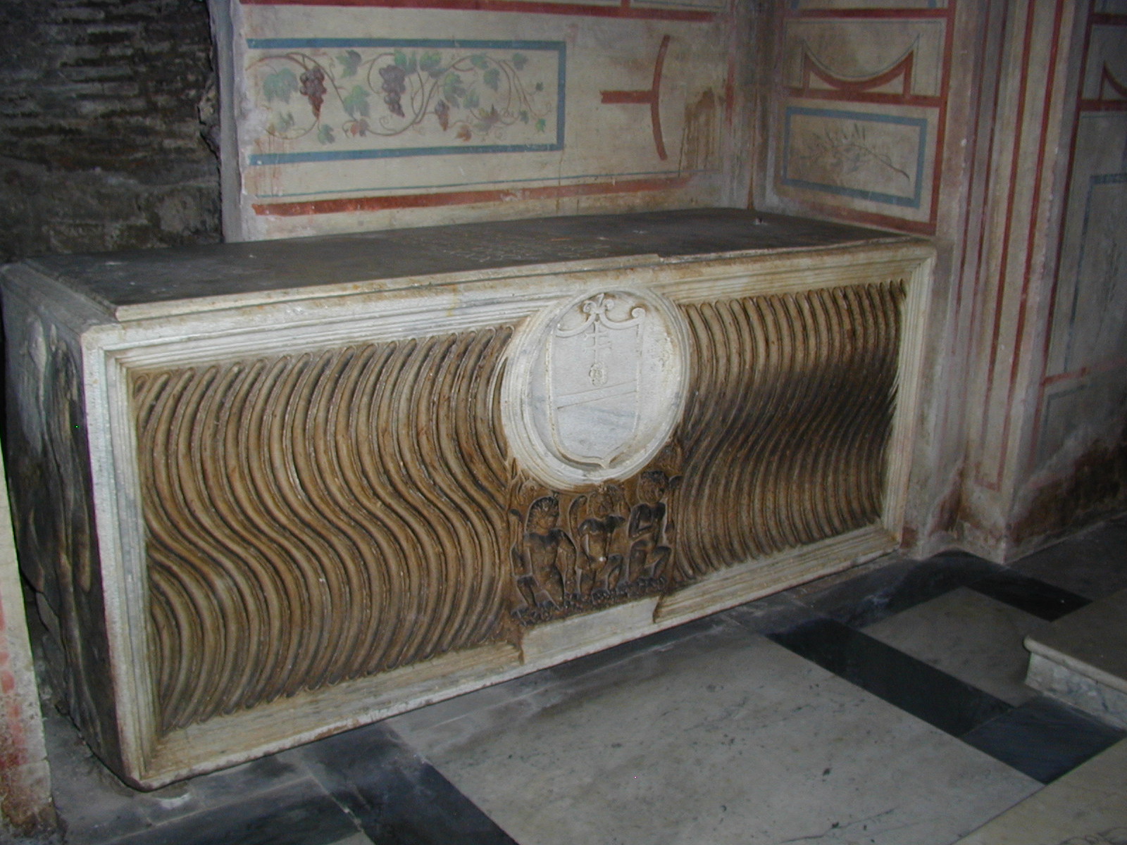 Apostoli confessio Cardinal Alessandro Riario tomb, antique strigillate sarcophagus 1524 Image: 4036 | |