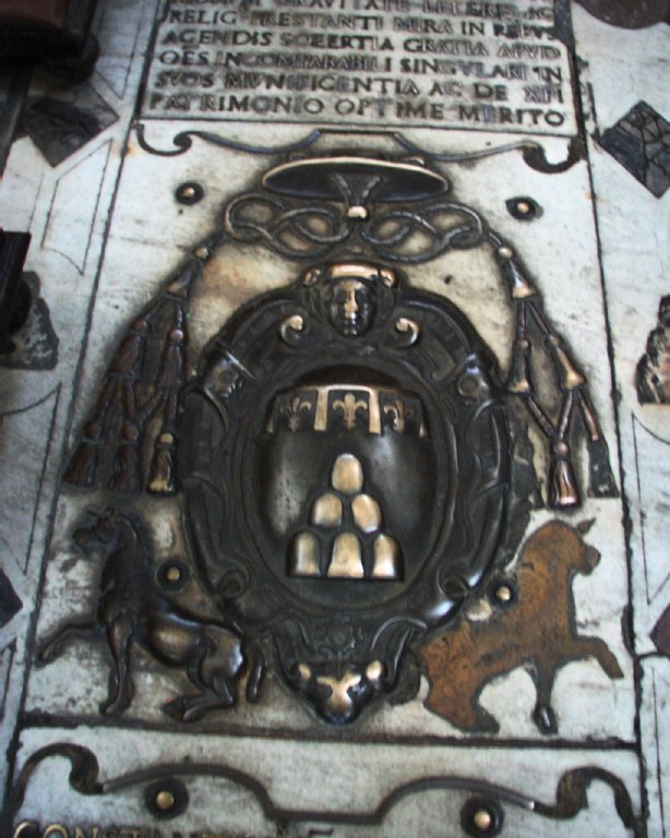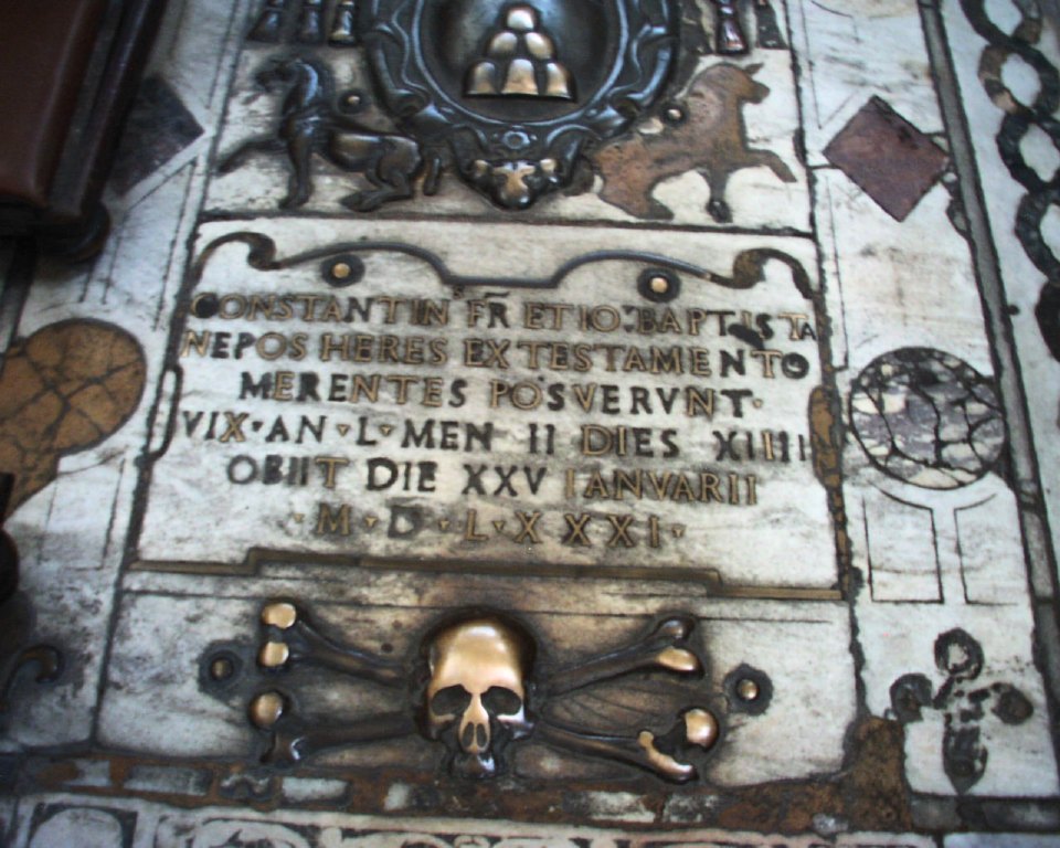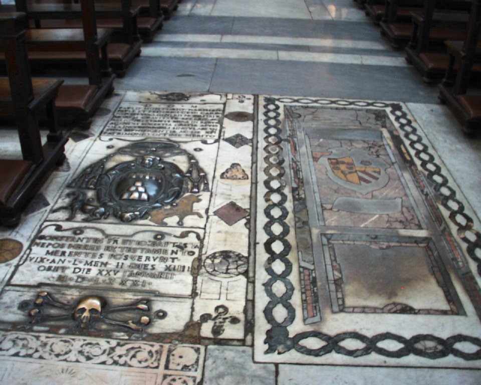Maria del Popolo interior rebuilt under Sixtus IV -, travertine 1472-7 tomb slabs in nave Image: 8223 | |