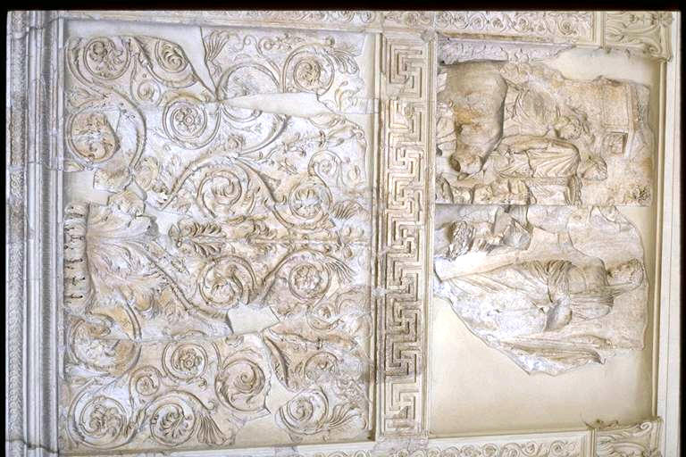 Ara Pacis Augustae: detail - R. front relief: [T] Aeneas sacrificing to the Penates; [B] calyx scroll - 13-9 B.C.