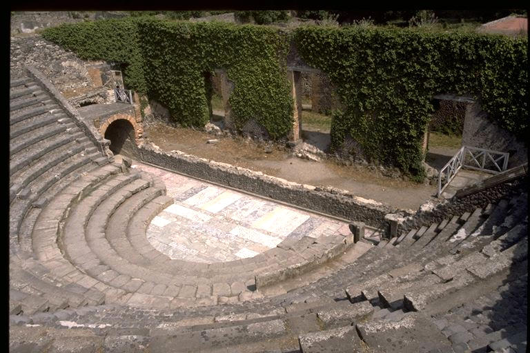 Great Theatre - Pompeii: interior view showing auditorium seating - orchestra - stage with skena - orig. ca. 2nd century B.C.